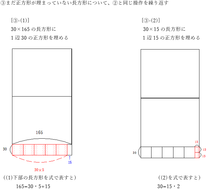 ③ 正方形が埋まりきらずに余った場合、残り部分の長方形の中で ②の操作を繰り返す