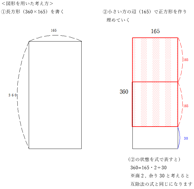 以上のような操作から、360×165の長方形は「15×15の正方形で埋め尽くせる」ことがわかります。さらに、この正方形は、360×165の長方形を埋め尽くせる正方形のなかでは最大のものとなります。