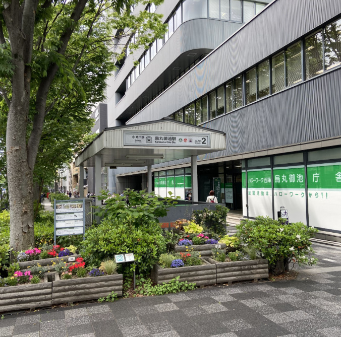 今回のスタートは地下鉄烏丸御池駅。京都市の2つの地下鉄路線、烏丸線と東西線が交わる交通の便のよいところです。周辺はビジネス街でオフィスビルが林立しています。
