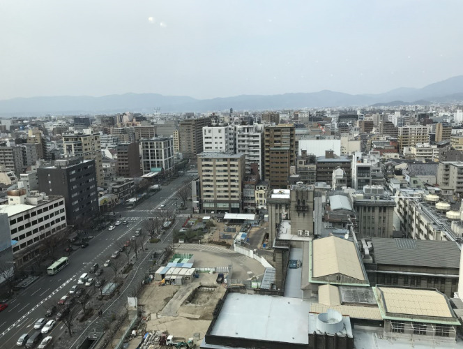 この高さの分、最上階からは京都の景色が一望できます。参考までに4年ほど前の写真ですが、最上階から見る風景を添えておきます。これまで歩いてきた側を見ています。右下に見える市役所の広場がまだ工事中ですね。市街地から、その向こうに広がる山までかなり遠くまで見通せることがわかっていただけると思います。
