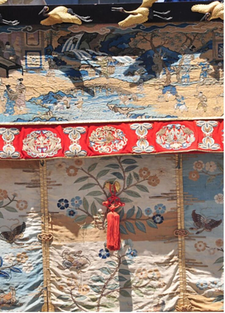 山伏山の周囲を飾る水引は「養蚕機織図」の綴織です。江戸時代後期の作品と伝えられ、蚕を飼って繭を取り、そこから紡いだ絹糸でできた絹織物です。