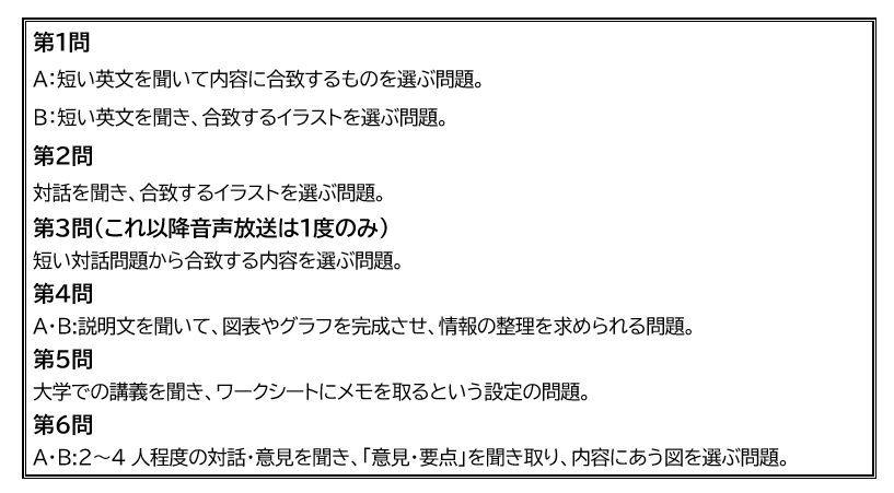 本題に入る前に、大学共通テスト 英語リスニング問題の出題形式を簡単にまとめておきましょう。