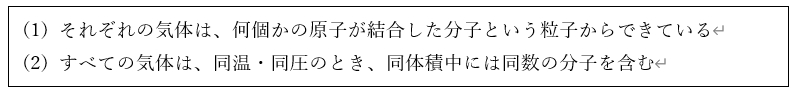 化学の問題でも使うことの多い「アボガドロ定数」は、もちろんこの(2)のアボガドロの法則と関わりのある内容ですが、アボガドロ定数が具体的に求められたのは分子説の発表からずっと先のことであり、アボガドロ自身が求めた値ではありません。誤解のないようにしておきましょう。