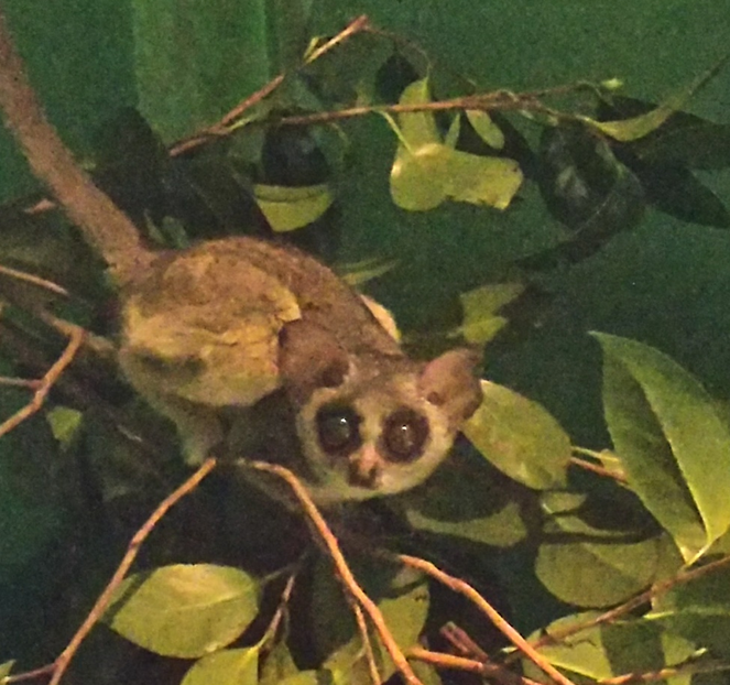 こちらは、前回もお見せしたショウガラゴ。夜行性です。顔の半分以上が目で占められています。夜行性の動物では、暗い中で少しでも光を多く取り込むために、この構造が必要なのですね。