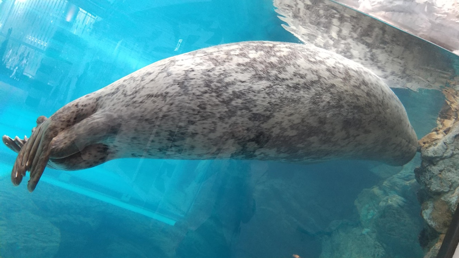 こちらはゴマフアザラシ。チューブ水槽を泳いで上がってくるのが売り、のはずです。だいたい寝ているような気もしますが。