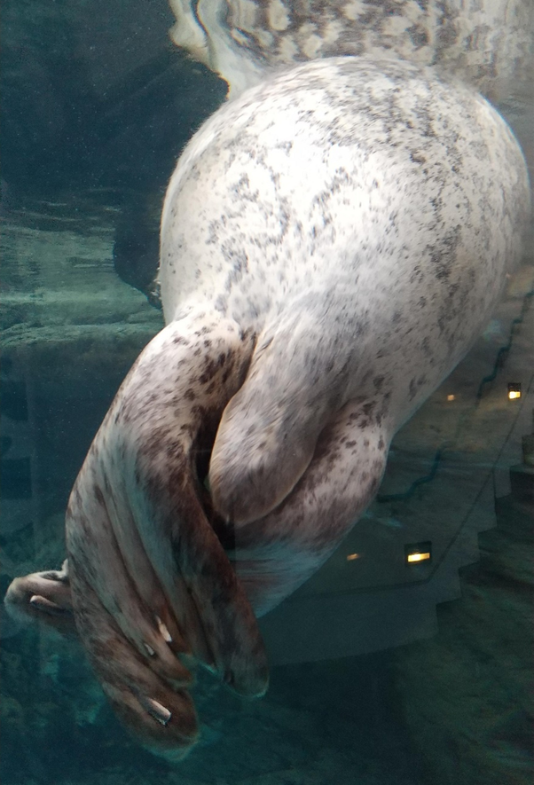 おかげでこちらも後足の爪までよく見えます。真ん中には短いしっぽ。アザラシは主に後肢の力で泳ぎますが、後肢を陸上で前に折り曲げることができないので「歩く」ためには使えません。陸では転がっているイメージですね。