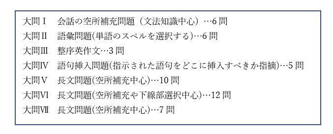 問われている知識は標準的なのですが、「知識をそのまま使う」という問題は少なく、ちょっと考えて解かないといけない問題が多いです。その辺はバランスが良いと思いますが、感覚頼みや丸暗記で勉強している人には厳しい問題です。動詞を覚える際に、文型や語法などの「使い方」を意識して学習しましょう。また、4文型→3文型の書き換え(give 人 モノ→give モノ to 人)のような中学生レベルの知識も聞かれることがあります。