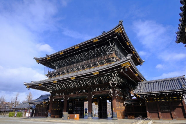 続きましては、本願寺です。これも非常に大きな寺院ですね。京都駅に向かうため、街中を車で走っていると否が応でも視線を向けてしまう、その存在感たるやすさまじいものがあります。先ほどの鎌倉新仏教の6つの宗派のうち、浄土真宗の総本山となっている寺院で、京都にかなり強く根付いている宗派ということもあり、京都では最も名を聞くものではないでしょうか。開祖は親鸞ですね。