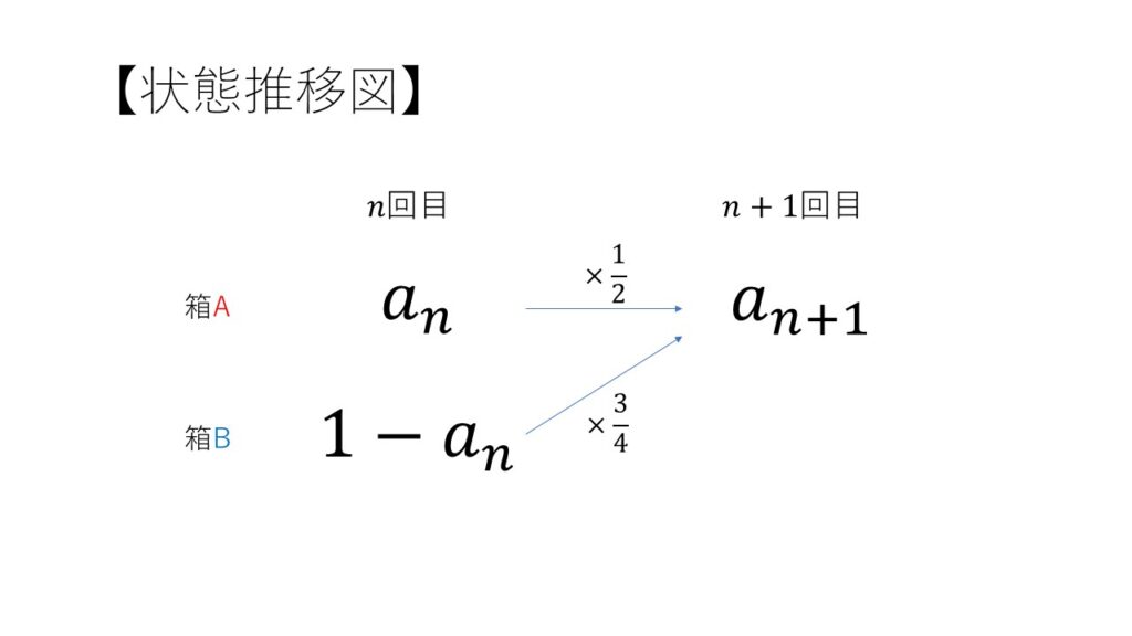 (1)、(2) … いわゆる「確率漸化式」の問題です。まず \(a_n + b_n = 1\) より \(b_n=1-a_n\) がわかります。確率漸化式の問題は「\(n\) 回目と \(n+1\) 回目に着目する」ことが定石です。以下のような「状態推移図」にまとめるとよいでしょう。