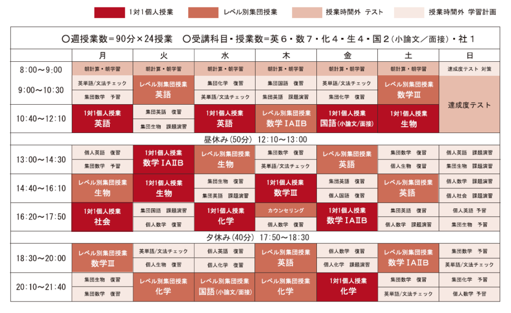 京都医塾ではオーダーメイドカリキュラムで授業が進むため、生徒一人ひとりの時間割は全く異なります。