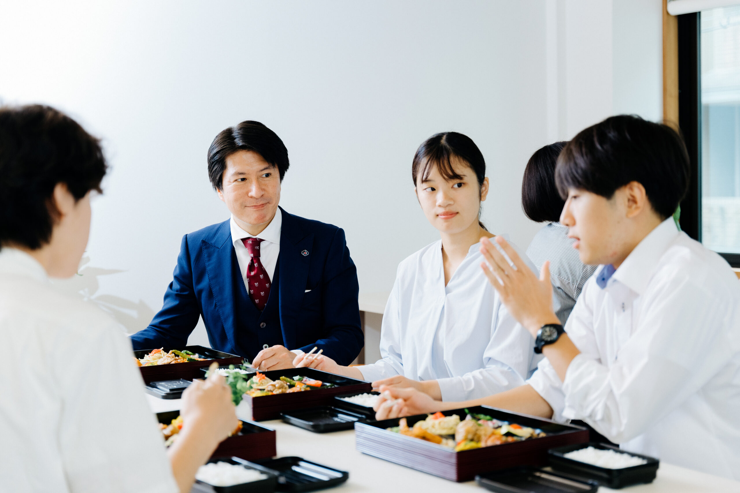 校舎内の食堂スペースで談笑しながら昼食をとって栄養補給ができます