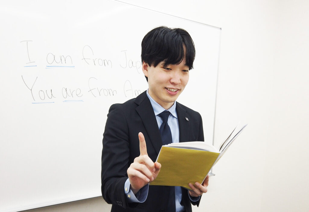 全部英語は冗談ですが、自分のキャラクターを変えて授業をしているのは本当です。講師一年目では、1対1の個別授業をたくさん担当し生徒の成長を支える中で、様々な気づきがありました。今年からは集団の授業も担当するようになり、今までと同じではいけないと思い、生徒の皆さんの反応を見ながら日々工夫をしています。